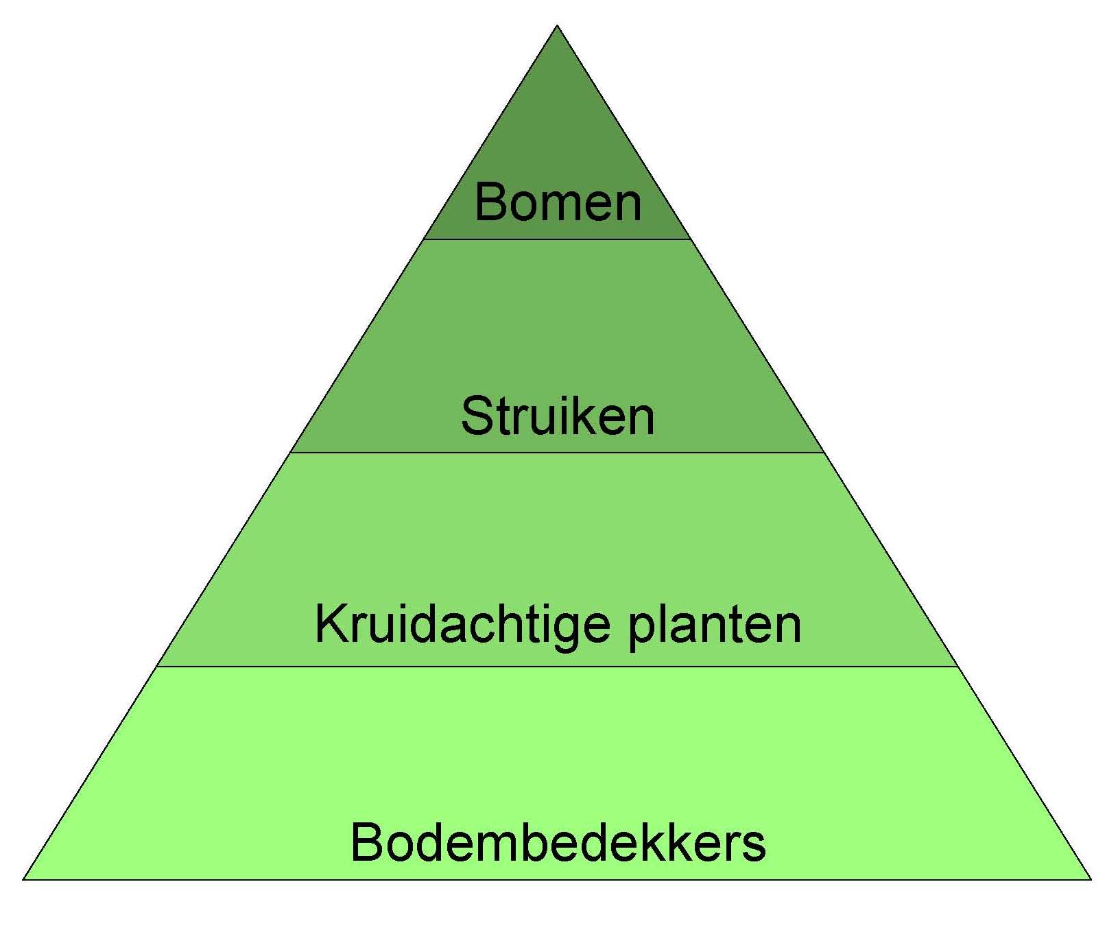 De truc is het opbouwen van de beplanting in lagen (zie het piramide-diagram). Dit komt overeen met de normale beplanting van een border, waarbij de hoogste planten (de bomen) achterin staan, dan de struiken, dan de kruidachtige planten (dit zijn de meeste eenjarige en vaste planten die in de winter bovengronds afsterven) en helemaal vooraan bodembedekkers. Zo krijgen alle planten zon en zijn ze goed te zien.