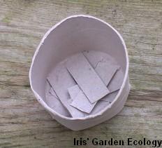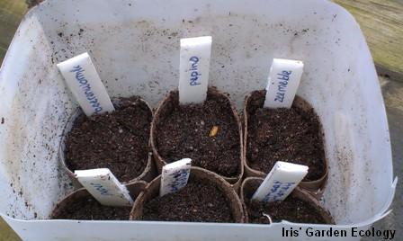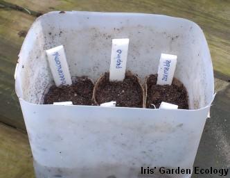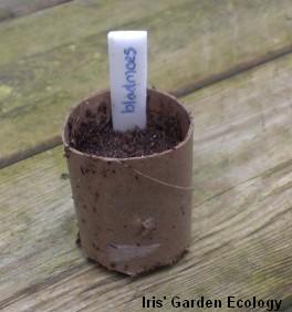 Als zaaigrond is het beste speciale zaaigrond te gebruiken: dat bevat minder voedingsstoffen zodat de jonge zaailingen niet verbranden en er zit scherp zand in zodat ze goed kunnen wortelen. Zaaigrond wordt bij de meeste tuincentra verkocht in deze tijd van het jaar. Verder zijn afvalmaterialen prima om als zaaibakjes te gebruiken: ik gebruik wc-rolletjes, want die zijn er genoeg, zijn biologisch afbreekbaar en kunnen theoretisch gezien met plant en al geplant worden, maar de afbraak duurt mij te lang dus ik gooi ze na gebruik op de composthoop. Een rolletje knip ik tot halverwege in, zodat die niet te diep wordt, dan knip ik ongeveer 1 cm van de onderkant weg en vouw ik de reepjes naar binnen en plet ze dan samen naar buiten om een bodempje te maken. Dat is handig, want dan kun je met het tot bakje gemaakte wc-rolletje aarde opscheppen tot deze vol is. Geloof me, de bakjes van bovenaf vullen met een schepje is onhandig en rommelig werk. Het bakje hoeft niet een perfect recht bodempje te hebben. De wc-rolletjes zet ik vervolgens in een waterdicht bakje, in dit geval eentje die ik van een halve melkfles heb gemaakt. Dan zijn er nog de labeltjes. Die kunnen van vanalles gemaakt worden: kartonnen of plastic pizzabodems, plastic van melkpakken of karton.