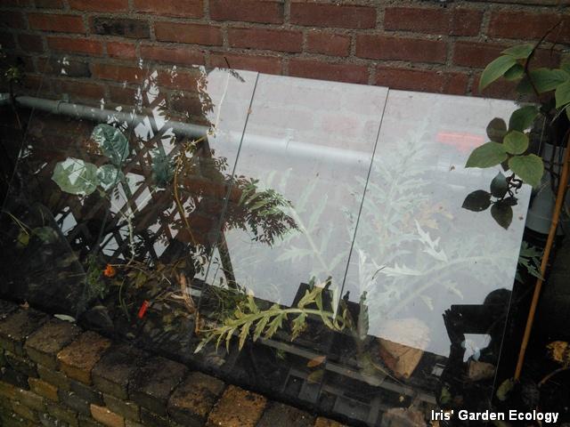 Mijn kas heb ik gemaakt van glazen planken die ik uit een oude kas heb gehaald, en door die schuin tegen een zonnige muur te zetten is een lekker warm plekje ontstaan. Ik heb er niet helemaal winterharde planten in staan, die nog klein waren toen ik ze er afgelopen herfst onder zette. Ze zijn veel langer doorgegaan met groeien dan hun soortgenoten op andere plekken en inmiddels zijn ze zo groot dat ze tegen de glazen panelen duwen. En dat is prima, want ik gebruik de kas als winterkas en dus staat deze opstelling ieder jaar maar tijdelijk. Het werkt zo goed omdat de muur erachter uit bakstenen bestaat en op het zuiden gericht is. Stenen nemen namelijk veel warmte op van de zon, die ze vervolgens langzaam weer loslaten. Zo krijgen de planten nog een tijd lang warmte als de zon al weg is.