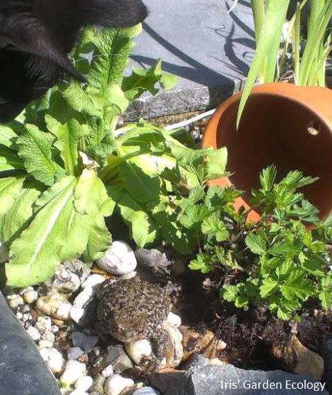 Nu we de tuin veranderd hebben, met veel groen in verschillende lagen én een vijver lijkt Archimedes veel meer op zijn plek. Hij zit regelmatig in of naast de vijver, maar vaak kom ik hem op totaal andere plekken tussen de planten tegen. Hij is niet echt schuw, als je beweegt zit hij doodstil, maar al snel beweegt hij zich weer langzaam en doelgericht verder. De katten vinden hem interessant, maar ze hebben hem nog nooit iets gedaan. Hij heeft nu zelfs een maatje: de grotere zwarte pad Confucius (ook geen idee of het een mannetje of een vrouwtje is).