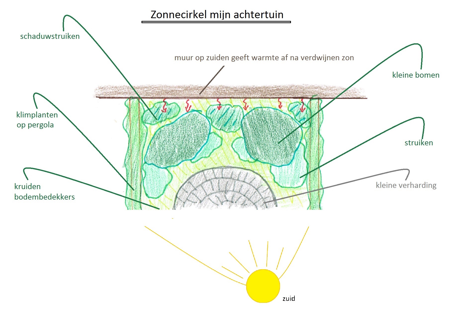 Het regent buiten en de bomen zwiepen in de koude wind. Waar zijn de zon en de warmte gebleven? We krijgen hier vaak minder zon dan we zouden willen, maar we kunnen wel zo veel mogelijk gebruik maken van wat we wél krijgen. Hoe? Dat leg ik uit met mijn eigen tuin.