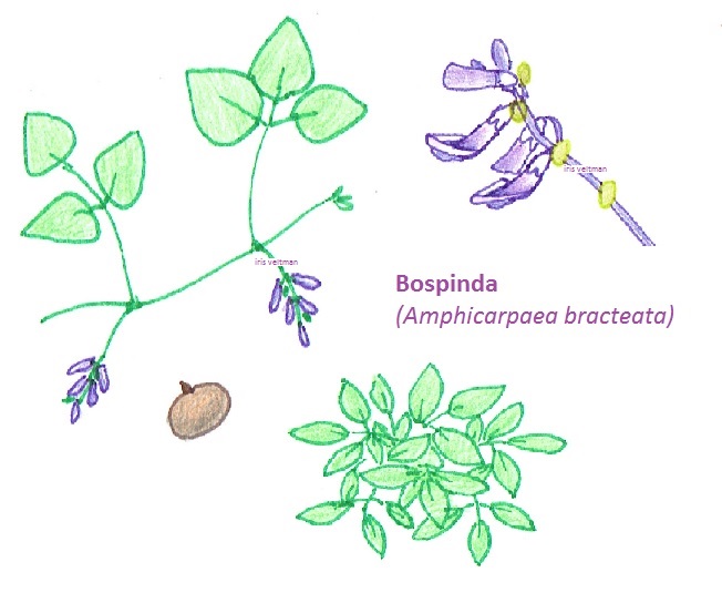 De bospinda (Amphicarpaea bracteata) is een bodembedekkende of klimmende vlinderbloemige plant. Hij bloeit in augustus/september met trosjes kleine paarsblauwe bloemen. Daarna produceert de plant zaden, die hij net als de echte pinda, vormt door zijn bevruchte bloem in de grond te boren en daar de noot te produceren. De noten die de bospinda vormt zijn ook eetbaar. Eigenlijk is de bospinda een eenjarige, maar doordat hij zichzelf ‘uitzaait’ komt hij meestal weer terug. Geef bospinda een licht vochtige bodem en zon of halfschaduw. |