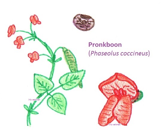 Met bonen zit je sowieso goed. Maar het mooiste vind ik de pronkboon (Phaseolus coccineus). Een mooie lange eenjarige klimmer, die zelf langs stokken of dunne stammen omhoog klimt met een kurkentrekker-vorm. De plant heeft meestal een rijke opbrengst en ook nog eens heel veel mooie bloemen. Hij doet het goed in de zon, maar ook in halfschaduw en wat de bodem betreft is hij niet erg moeilijk. Pronkbonen zijn met rode bloemen, witte bloemen en rood-en-witte bloemen te krijgen. |