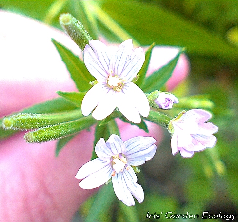 Dus vol spanning heb ik gewacht op de bloei, zodat ik hem kon determineren. En ik meen het echt als ik zeg vol spanning. Iedere dag ben ik ze even langs gegaan en was dan toch wel teleurgesteld dat ze nog steeds geen bloemen hadden. Maar deze week, eindelijk, bloemen! Iets wat ik mijn man ook superblij mededeelde, waarop hij enigszins verbaasd reageerde. Ach, hij is het gewend. Dus al mijn determinatie-gidsen erbij (vier, ik check graag meerdere bronnen), en wat bleek? Een familielid van het wilgenroosje. Grappig, wilgenroosje wilde ik nog steeds eens hebben. En alleen maar een compliment voor mijn bodem: deze soort komt vooral voor op voedselrijke, iets vochtige grond. Meestal bij moestuinen. Doe ik toch even goed vind ik, zonder grondbewerking anders dan mulchen! En nog leuker: hij is eetbaar! Bladeren én bloemen! Dus meteen een blaadje in de mond gestopt en kauwen maar. Prima smaak.