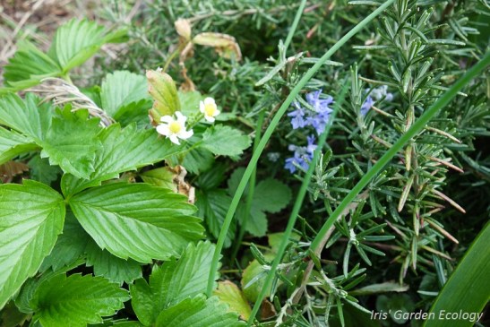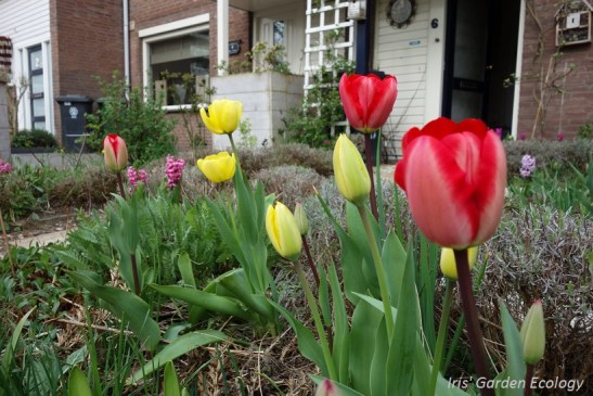 Deze week ben ik weer thuis. Ik ben “out of the woods”, zoals Hillary deze week toevallig zei, grappig genoeg. Ik ben ook weer aan het werk, maar behalve donderdag verder alle dagen in het zonnetje tussen de bloemen, insecten en planten in de tuin. Zo zit ik ook nu weer in het ochtendzonnetje van mijn voortuin. Vanmiddag verhuis ik naar de meer schaduwrijke achtertuin. Mijn voortuin warmt sneller op dan de achtertuin want krijgt eerder op de dag en in het jaar volle zon. Bovendien is het mijn visitekaartje en wil ik mensen vrolijk maken als ze erlangs lopen. Zodoende is het daar een groter en meer uitgesproken spektakel dan in de achtertuin. De gele kornoelje en krokussen hebben plaatsgemaakt voor een happy kleurenboel: hyacinten, tulpen, sneeuwroem, witte en rode Japanse dwergkwee, honingbes, rozemarijn en zelfs al bosaardbei. De kleuren matchen niet volledig; ik discrimineer niet, dus als ik een pakketje gemengde bollen krijg dan gaan die er gewoon bij 😉 Het is genieten zodra je de deur opendoet en de geur van de hyacinten je neus binnendringt.