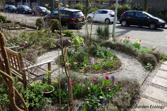 Deze week ben ik weer thuis. Ik ben “out of the woods”, zoals Hillary deze week toevallig zei, grappig genoeg. Ik ben ook weer aan het werk, maar behalve donderdag verder alle dagen in het zonnetje tussen de bloemen, insecten en planten in de tuin. Zo zit ik ook nu weer in het ochtendzonnetje van mijn voortuin. Vanmiddag verhuis ik naar de meer schaduwrijke achtertuin. Mijn voortuin warmt sneller op dan de achtertuin want krijgt eerder op de dag en in het jaar volle zon. Bovendien is het mijn visitekaartje en wil ik mensen vrolijk maken als ze erlangs lopen. Zodoende is het daar een groter en meer uitgesproken spektakel dan in de achtertuin. De gele kornoelje en krokussen hebben plaatsgemaakt voor een happy kleurenboel: hyacinten, tulpen, sneeuwroem, witte en rode Japanse dwergkwee, honingbes, rozemarijn en zelfs al bosaardbei. De kleuren matchen niet volledig; ik discrimineer niet, dus als ik een pakketje gemengde bollen krijg dan gaan die er gewoon bij 😉 Het is genieten zodra je de deur opendoet en de geur van de hyacinten je neus binnendringt.