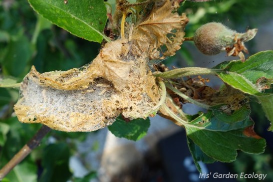 Maar dieren alom. Ik registreer zo veel mogelijk van wat ik om mij heen zie op Tuintelling.nl – maar er gebeurt zó veel, ik probeer ook nog te werken. Toch kan ik het soms niet helpen om een beweging met nieuwsgierigheid te volgen – zo spotte ik een pimpelmeesje dat steeds terugkomt om de bladluizen uit de topjes van mijn aalbes te peuzelen. En een vreemde kluwen in de appelboom bleek het spinsel van een stel rupsen van de stippelmot. Dat hoort er natuurlijk ook bij, bladeters. Het is een heel klein plekje op de boom, dus ik hou het gewoon in de gaten. Er zijn zat dieren in mijn tuin die die rupsen maar al te graag eten, dus veel zorgen maak ik me er echt niet om. Wel grappig, hoe je zo steeds weer iets nieuws kunt ontdekken. En op die manier hele dagen spendeert met gewoonweg lekker in de tuin zijn.