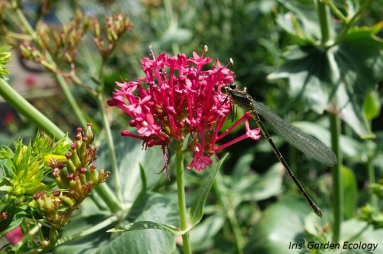 Volgens mij is dit een grote roodoogjuffer (vrouwtje) op rode spoorbloem. Volgens Libellennet komt deze voor op allerlei stilstaande wateren met uitgebreide drijvende vegetatie. Gezien de nabijheid van een grote vijver met oevervegetatie (en veel alg) weet ik niet of deze juffer hier zit vanwege die waterpartij of mij eigen, maar een mooie is het wel.
