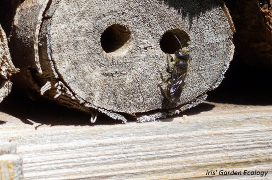 Hier komt een metselbij juist uit een (zelfgemaakt volgens mij, of misschien heeft een ander insect het eerder al gedaan) gaatje in het insectenhotel. Het is duidelijk te zien waarom het een metselbij genoemd wordt – het ‘metselt’ van modder de wanden van het gaatje dat ze gekozen hebben, zoals in het hout of de holle stengels van een insectenhotel. Deze en de hierboven genoemde bijensoorten zijn niet erg kieskeurig in hun plantenkeuze, wat verklaard dat ik ze veel zie in mijn tuin (die ligt in de buitenring van de stad).