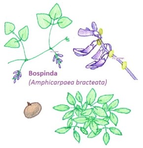 Eentje met veel potentie voor een eetbare bostuin of schaduwrijke plek is de bospinda. ‘Echte’ pinda’s (Arachis hypogaea) zijn net als de bospinda peulvruchten, maar ze worden gerekend tot de noten vanwege hun eigenschappen – ze zijn rijk aan eiwitten (25,8%), koolhydraten (16,1%) en net als noten ook een bron van onverzadigde vetzuren. Maar dat is een tropische plant. Een alternatief voor onze streek is de bospinda (Amphicarpaea bracteata). Deze zou qua voedingswaarde op de echte pinda moeten lijken, hoewel ik hier geen cijfers over kan vinden. Toch is dit een interessante plant om toe te passen vanwege zijn bodembedekkende eigenschappen, zijn voorkeur voor de schaduw en omdat het een peulvrucht is, die als familie sowieso goed zijn wat betreft eiwitten en koolhydraten.