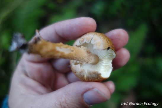 Hier heb ik tenminste wél een foto van de onderkant genomen. Geen ring, lamellen die scherp van de steel afbuigen. Groeit in volle grond in de buurt van een kornoelje (hoewel op 2 m afstand van een bijna volledig weggerotte eikenhouten stam). Hoe dan ook, het is een saprofyt of een mycorrhiza en de beestjes in mijn tuin eten ervan – dus ik ben er sowieso blij mee.