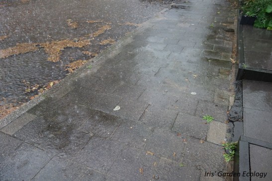 Mijn voortuin is erg groen, zoals je kunt zien (en momenteel al een paar maanden vrijwel niet onderhouden, dat kun je wel zien aan de plantengroei in het pad). Net als de vorige keer stroomde er geen water vandaan naar de straat.