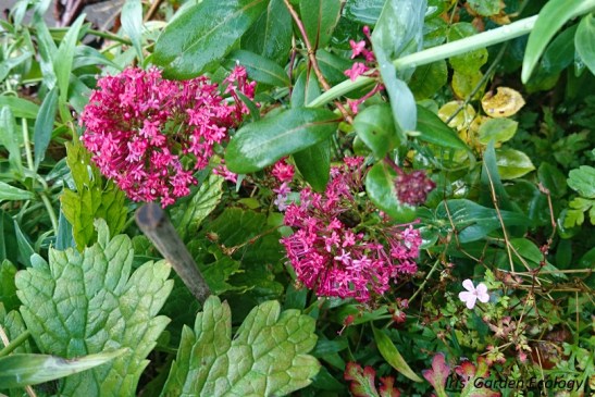 Rode spoorbloem en een klein bloemetje van robertskruid, een ‘onkruid’ die ik in mijn tuin vaak bewust laat staan vanwege de insecten die ervan profiteren.