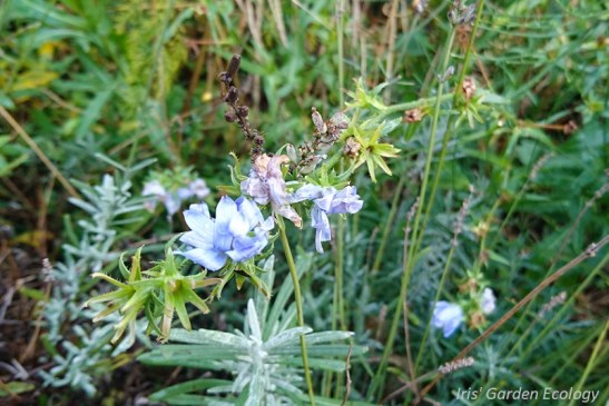 Opnieuw een insectenplant: mijn wilde cichorei bloeit ook nog, hoewel de bloemen zich meestal gesloten houden vanwege het vochtige weer.