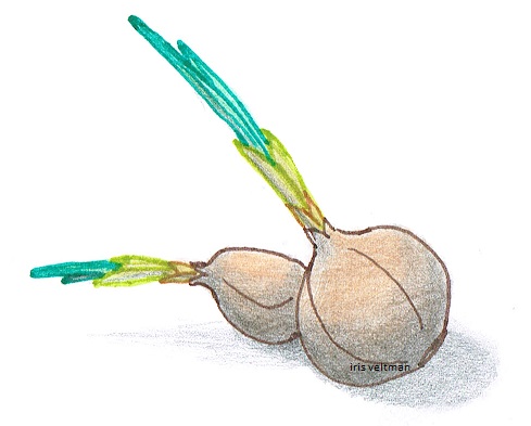 Na het werken en nog net voordat ik *hatsjoe* ziek werd zag ik even de kans om een wandelingetje te maken. Ik bereidde een blogpost voor en wilde daar tegelijkertijd foto’s voor nemen en koos een route die langs allerlei tuinen en volkstuinen loopt. Voor die specifieke blogpost kwam ik een beetje bedrogen uit – daarover de volgende keer meer – maar bij het lopen langs de opgedirkte en opgeschoonde volkstuintjes vond ik wat interessants in het gras. Het herinnerde me aan een wandeling die ik in het najaar van 2017 maakte, door de duinen bij Egmond aan Zee met een groepje van Groei&Bloei. Die keer vonden we in de berm naast volkstuintjes een hele zooi gedumpte aardappelen. Meerdere mensen raapten een avondmaaltje bij elkaar, terwijl ik mij afvroeg of ze soms uit de oren groeide bij wie ze gedumpt had, dat ‘ie er zo graag vanaf wilde. Enfin, ook dit keer was het raak. Iemand had voorjaarsbollen gedeeld en het overtollige in de berm gegooid. Wellicht niet de meest ecologische manier om planten uit de tuin te verwijderen – denk verspreiding van invasieve soorten en bestrijdingsmiddelen – maar daar heb ik het nu even niet over. Nee, het leuke was dat ze al aarzelend uitliepen. En in mijn achtertuin kan ik nog wel wat voorjaarsbollen gebruiken, zeker het soort dat verwildert en zichzelf uitbreidt, zoals wat-voor-bollen-dit-dan-ook-mogen-zijn. Dus ik zocht een paar mooie, gave bollen uit, wikkelde ze voorzichtig in een zakdoek en stopte ze in mijn jaszak, om ze bij thuiskomst uit te planten. Geen idee wat het zijn, narcissen misschien? Er valt nu nog niet zo veel te zien, maar ik wacht graag af. De charme van zomaar een stel bollen voor het oprapen vinden zit ‘m – vind ik – toch vooral in de verrassing.