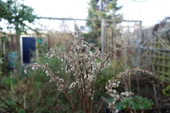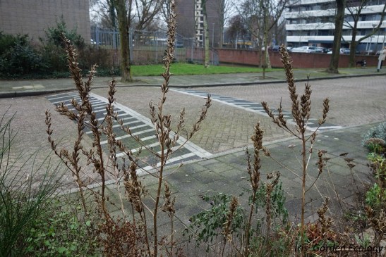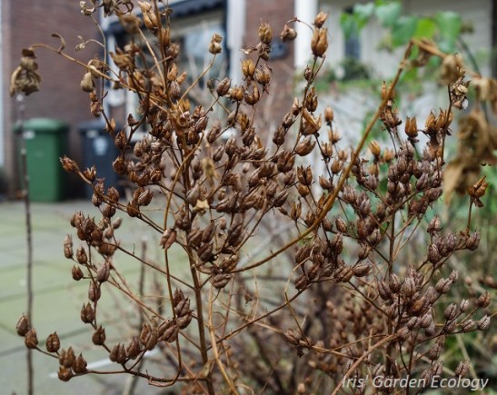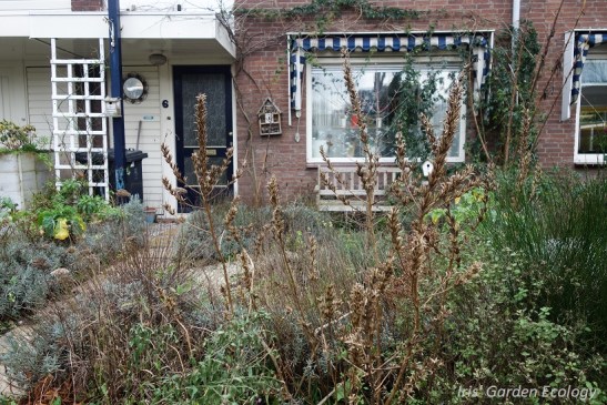 Dit is het uitzicht vanuit mijn voortuin – een stuk boeiender dan een kale tuin direct naar de straat, toch? Bovendien zijn vogels gek op de zaaddozen van de teunisbloem, die op de foto fier overeind steken.