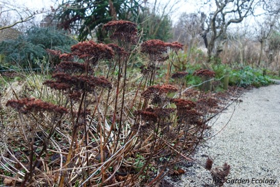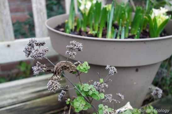 Dit is momenteel mijn eigen voortuin. Wat ik er zo heerlijk aan vind is dat er nog steeds van alles te zien is, ondanks de winter. En zoals je ziet heb ik niet heel veel groenblijvende struiken erin staan. Dat vind ik niet nodig; ik geniet van het bruin – zo’n groenblijvende struik is wel aardig, maar ziet er toch jaarrond grotendeels hetzelfde uit. Daarom maak ik graag combinaties met een paar groenblijvende planten in verschillende plantlagen (zoals hier bodembedekkers, struiken, klimplanten).