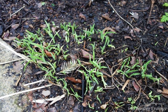 Als je zo’n kleed van bladeren maar een rommeltje vindt, dan kun je het ook bedekken met compost zoals op deze foto. Het voordeel van organisch materiaal op de bodem is dat de bodem warmer blijft, onkruid onderdrukt wordt, dieren zich erin kunnen verschuilen, het een gezond bodemleven (en dus gezonde planten) stimuleert en voedingsstoffen afgeeft waarop de planten kunnen groeien. Dus blad laten liggen en/of compost strooien heeft nogal wat voordelen ten opzichte van een geschoffelde en omgespitte grond.