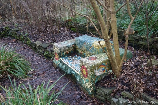 En mocht je zo’n bruine tuin toch maar saai vinden, zorg dan voor een vrolijke eyecatcher, zoals dit bankje in de Kweektuin.