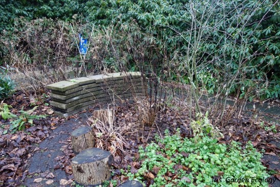 De voorbeeldtuintjes van Steenbreek 023 in de Kweektuin. De kale takken en dode plantenstengels vormen een intrigerende wintertuin en de grond is bedekt met bodembedekkers en bladeren; een geweldige verstopplek voor insecten (en amfibiën) en een bron van voedsel voor vogels, die van die insecten en zaden komen eten. Zo helpt een rommelige tuin dieren en verhoogt het de stedelijke biodiversiteit.