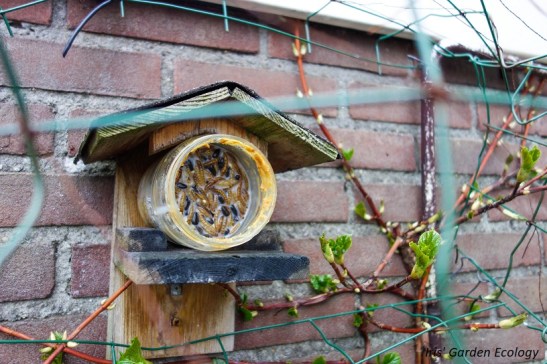 Tip! Als we het toch over het helpen van vogels hebben: met de start van het broedseizoen hebben de volwassenen en hun jonkies veel vet en eiwit nodig. Maar dankzij de kou van de afgelopen weken zie ik – hier thuis tenminste – nog bar weinig insecten. Je kunt een vetbol ophangen op basis van insecten. Op dit moment hebben de vogels veel eiwitten en vetten nodig, zowel de volwassenen als hun jonkies en insecten zijn een goede bron. Voor de jonkies is dat zelfs een stuk beter dan pindakaas of een zaadbol, want dat dierlijke kunnen ze beter verteren. Van pindakaas gaan ze dood. Insectenvetbollen dus. Je kunt ze kopen of zelf maken. Die in de bovenstaande foto maakte ik van een lege pot met ossenwit en een meelwormen-mengsel. Supersnel en de vogels zijn er gek op. Kijk voor mijn werkwijze hier (die maakte ik met zaden, dus vervang het zaadmengsel voor meelwormen).