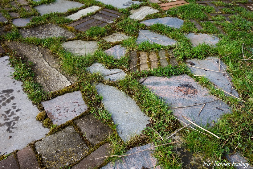 In de buurtontmoetingsplek van de Wilde Weelde Wereld in Appeltern ligt deze bestrating, gemaakt van oude kapotte stenen van omwonenden, waartussen planten mogen groeien.