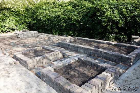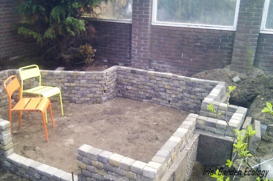 Vooral voor de verhoogde border en de zitkuil, waarbij de druk van de aarde zwaar op zo’n muurtje drukt, is het goed dat die muurtjes extra breed zijn geworden (zo’n 15 cm) dankzij de nu onzichtbare fundering van grindtegels aan de binnenkant. De grote tegels voorkomen ook dat aarde en water uitspoelen uit de borders.
