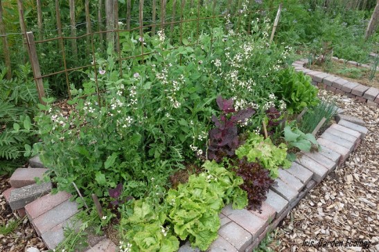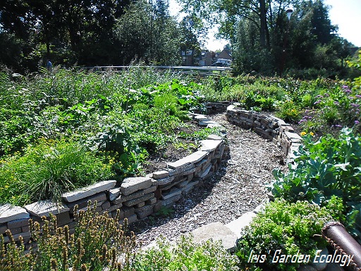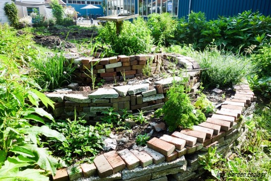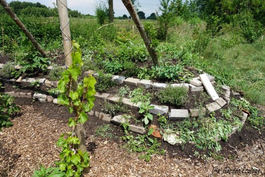 Een alternatief op de kruidenspiraal in de permacultuurtuin van Boerderij De Mikkelhorst (foto 2016). Wat hier overigens niet helemaal goed gaat is dat de aarde op de niveau’s afloopt – dan stroomt water er vanaf en erodeert de bodem. Daardoor blijven bovendien de stenen niet goed liggen. Zorg om dat te voorkomen dat de stenen van een volgend niveau altijd enigsinds verzonken liggen in de vorige en dat de aarde erachter niet aflopend is.