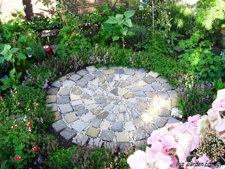 Hier heb ik alle kapotte trommelstenen die uit mijn voortuin kwamen in een spiraalvorm gelegd voor een kleine patio in mijn achtertuin (foto 2012).
