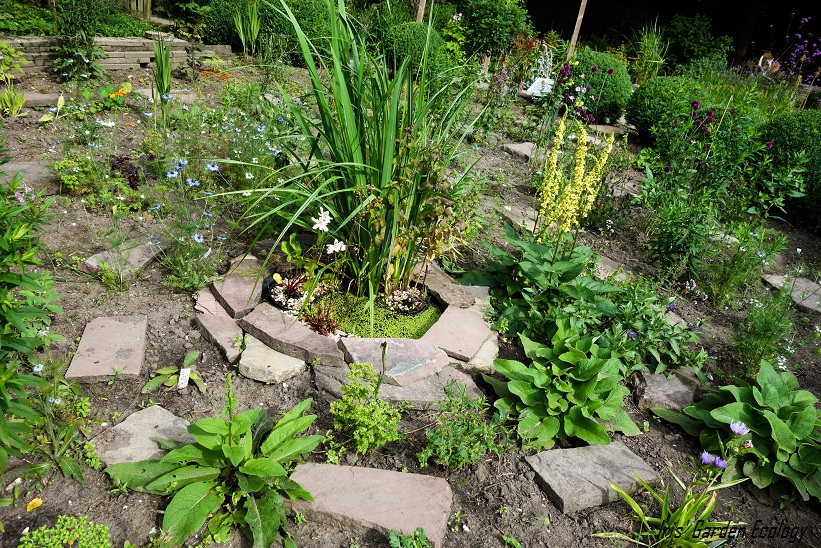 Mooi voorbeeld van gestapelde tegels voor een levendige vijver in de kleine beestjestuin van Wankja Ferguson – in de Wilde Weelde Wereld in Appeltern (foto genomen in maart 2016, dus de vijver is nog kaal).