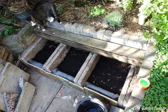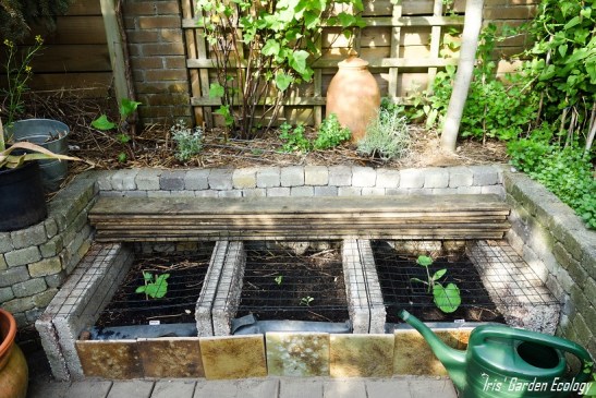Wil je zelf ook zoiets maken? Ik zal een paar manieren geven hoe je dit project naar je eigen tuin zou kunnen vertalen. Ten eerste zijn de zware oude cement- of grindtegels nodig voor de fundering. Ze zijn dik en stevig, vandaar. Gebruik dus niet zomaar iedere steen of tegel. Deze zijn 60x40x5 cm. Als je de bakken niet inbouwt zoals wij deden in de nissen van de zitkuil, dan maak je de achterkant het beste dicht met een dubbele rij ingegraven tegels. Voor extra stevigheid kun je dan rond de 3 buitenwanden van de achter- en zijkanten nog een enkele rij grindtegels voor 3/4 ingraven, zodat die de tegels die voor 1/4 ingegraven zijn tegenhouden. Of je maakt er een constructie van hout omheen. Of je gebruikt ‘stalen hoeklijnen’, zoals mijn man ze me op dit moment dicteert, om de hoeken aan elkaar te bevestigen. Wat natuurlijk ook kan en wellicht handig is als je graag rug- en/of armleuningen hebt, is er een muurtje omheen te metselen. Daarin zou je aan de buitenkant zelfs nog planten kunnen laten groeien. Opties genoeg in ieder geval, maar wat mij betreft een geslaagde manier om je ruimte zo effectief én verantwoord mogelijk te gebruiken.