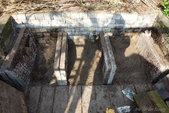 De fundering: drie bakken met aan iedere zijde dubbele ingegraven grindtegels. Het worden verhoogde bakken die open zijn onderin, zodat de wortels in contact staan met de bodem eronder.