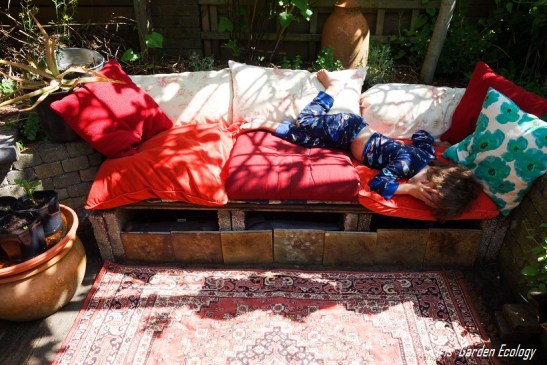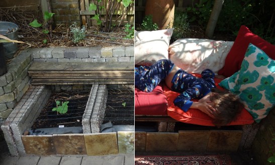 Zodra de kussens lagen heeft mijn zoontje zich de bank toegeëigend en ik krijg hem er niet meer vanaf voor een foto… Dus bij deze: de moestuinbakbank als luie bank meteen in gebruik 😉