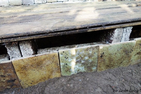 Voor die tweede bank maakte ik van oude plavuizen en stenen een stapelmuurtje. Tijdens de sloop van de oude loungebank en de bouw van beide banken kwamen we meerdere insecten, spinnen en padden tegen die zich tussen de tegels verstopten. Één grote bruine pad hebben we Pythagoras genoemd (goed idee, meneer Fruitberg 😉 ). Ik wilde ze graag weer een nieuw plekje geven en waar beter dan het loze, schuine stukje? Het trekt wel slakken aan, een nadeel voor de moesplantjes waarmee ik rekening moet houden – maar ik ben vooral blij met al die roofdieren.