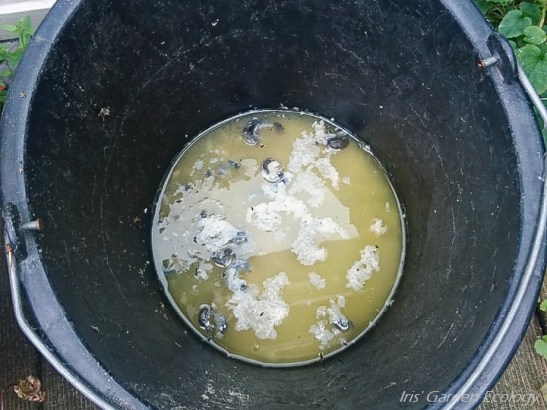 Vanwege de droogte en de sinds weken lege regenton gebruikten mijn man en ik zo veel mogelijk ‘alternatieve waterbronnen’ om de planten die het wel erg moeilijk hebben in leven te houden. Zo gebruikten we kookwater van sperziebonen en aardappelen… wat we nogal vaak eten. We koken ze zonder zout, dus dat kan prima de tuin in. Meestal gebruik ik het kokend heet om onkruid tussen mijn tegels kapot te maken, maar dat groeide toch niet. Dus lieten we het in plaats daarvan afkoelen en goten het dan tussen de planten. Maar één keer had mijn man het kookwater van aardappels (met nog een klein beetje aardappelprut erin) in een emmer gegoten om te koelen en zijn we het vergeten… Tot twee dagen later.
