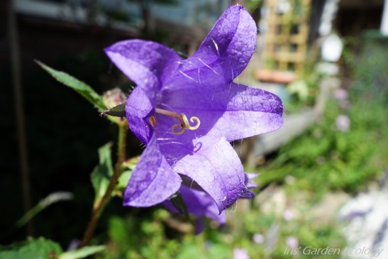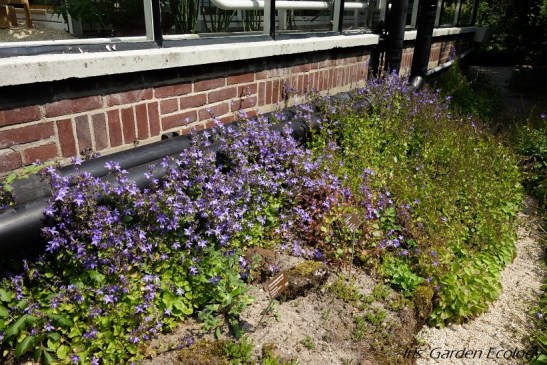 De kieren van mijn stapelmuurtjes vullend, kruipend langs de trappetjes, badend in de zon of verstopt tussen de struiken van mijn voedselstruweel, onder de oppottafel of langs de rand van het terras: er groeien heel wat klokjesbloemen in mijn voor- en achtertuin. Insecten maken er dankbaar gebruik van, waaronder bijen. Voor klokjesbijen zijn de planten zelfs van levensbelang. In veel tuinen staan ze gewoonweg omdat ze mooi zijn. Zo is het kruipklokje (Campanula poscharskyana) bij mijn terras aan komen ‘wandelen’ vanuit de tuin van de buren. Hij begon als een pluk groen naast de achterdeur en reikt sindsdien steeds verder langs de rand tussen het huis en het terras, ongehinderd door de schaduw. Ik vind ‘m prachtig, de hommels en bijen ook, dus laat ik ‘m lekker gaan. Hoe meer groen, hoe beter. Maar dit klokje is niet alleen mooi, hij is ook eetbaar! En dat geldt voor de meeste (biologisch gekweekte) klokjes.