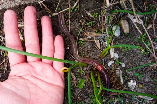 De voortuin, een grote kale zandbende toen ik er met tuinieren begon, is inmiddels onherkenbaar veranderd. Niet alleen qua uiterlijk, maar ook qua grond. Al een paar jaar is de aarde donker en kruimelig zo ver als ik graaf als ik iets moet planten, maar deze week kreeg ik een extra goed teken. Wormen. Een hele hoop. Kleine en hele grote, zoals op de foto hierboven.