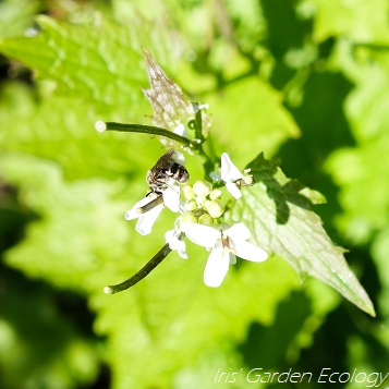 Dit bijtje is nog geen 5 mm groot, vandaar dat ze niet makkelijk scherp op de foto te krijgen was. Het is een gewone dwergzandbij, die waarschijnlijk vanuit de duinen en parken in de buurt naar mijn tuin is overgevlogen. Het valt me op dat ze massaal afkomen op de bloemen van de look-zonder-look in mijn tuin, die inmiddels hele kluiten vormt onder mijn appelboom.