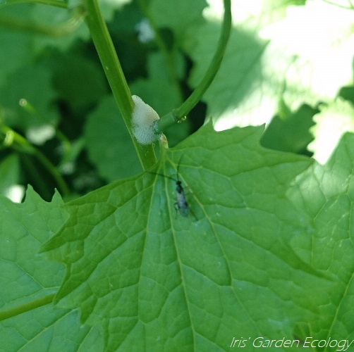 Zo klein dat ik hem niet scherp kon fotograveren, dit sluipwespje, samen op de foto met een verstopt spuugbeestje.