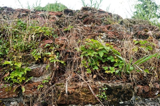 Tot slot nog een afgebrokkeld stuk muur waar de bosaardbei prachtig schuin naar beneden groeit. Richting rechtsonder groeien er verder o.a. bijvoet en muurleeuwenbek. Het kluitje links bovenin lijkt sterk op kruipend zenegroen, wat erop zou wijzen dat het een vochtige, humusrijke plaats is. Erboven groeien mogelijk Canadese fijnstraal en een plant die, naar ik vermoed, behoort tot het basterdwederik/wilgenroosjes-genus. Verder groeit uit verschillende kieren smalle weegbree.