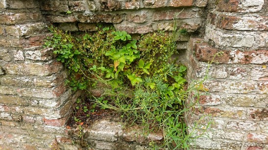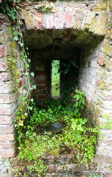 Water (met voedingsstoffen uit bijvoorbeeld stof) druppelt omlaag in dit kijkgat en verzamelt zich hier, waardoor allerlei planten het er naar hun zin hebben. Er groeien o.a. klimop, brandnetel, muurleeuwenbek, braam, wilgenroosje (vermoed ik), bosaardbei én robertskruid. Niet in dit stuk, maar in veel andere vochtige hoeken van de ruïne groeit ook zevenblad.