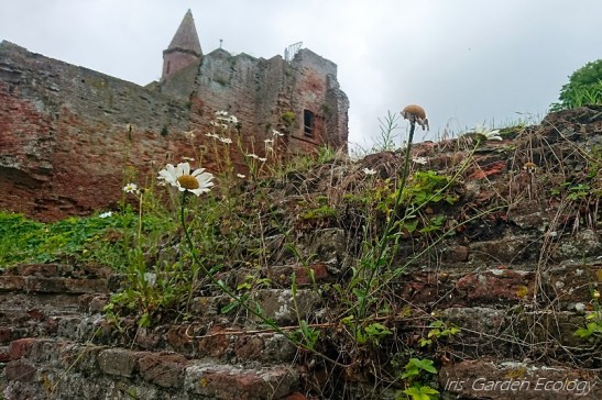 De dikke muur is hier grotendeels verdwenen, maar op de bovenkant hebben zich mos en planten gevestigd die op hun beurt weer aarde, vocht en voedingsstoffen vasthouden. Zo is er een groeizame laag ontstaan die zorgt voor een door de natuur gemaakt groendak, vol met blaassilene, pimpernel, smalle weegbree en duizendblad. Hommels vlogen af en aan terwijl ik hier foto’s nam. De gele bloemen zijn schermhavikskruid, denk ik, en de scheuten onderin lijken toe te behoren aan het walstro-genus.
