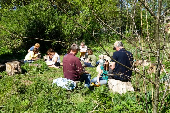 Bovenstaande foto schoot ik afgelopen voorjaar, terwijl mijn cursisten druk aan het overleggen waren. Het hoorde bij de verkenning van verschillende technieken om water te bergen, te vertragen, te zuiver en te gebruiken. Als het weer ook maar enigszins meezat werkten we buiten, want in de tuin van PermacultuurCentrum Haarlem, waar het plaatsvindt, heb je een prachtig groen leslokaal en waar je met het zonnetje in je rug gelijk in de juiste stemming komt.