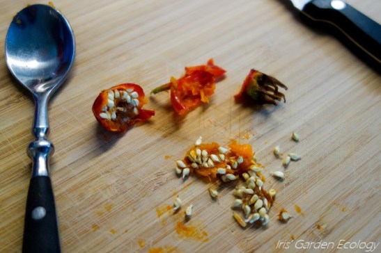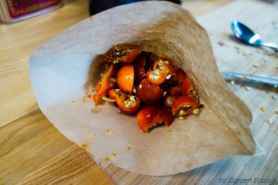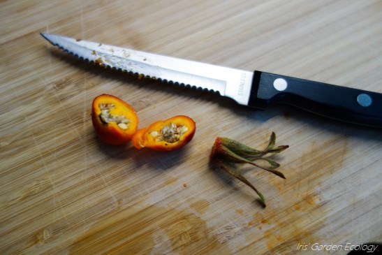 Voor de thee sneed ik de bottels simpelweg doormidden (en verwijderde het kroontje). Ik controleerde het vruchtvlees op beurse plekken, die ik eruit sneed omdat die niet lekker zijn en beestjes kunnen bevatten. Ik brak de grootste bottels vaak nog wat extra open, om een gronde inspectie te doen op larven want deze lichting had daar best veel last van. Tja, eten uit eigen tuin of uit de natuur kent nou eenmaal een risico, maar weggooien doe ik niet zo snel 😉
