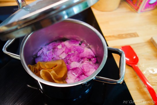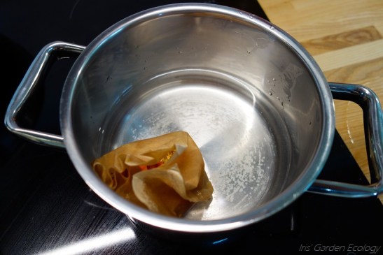 Ik had niks om het koffiefilter dicht te houden, maar heb hem niet geheel ondergedompeld en goed in de gaten gehouden, wat prima ging. Ik heb zo’n 500 ml koud water toegevoegd en mijn zoontje deed de rozenblaadjes erin. Langzaam liet ik het aan de kook komen.