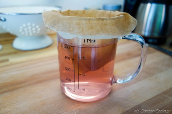 Simpele manier van alles eruit filteren: door een koffiefilter in een maatbeker gieten! Je kunt de mooie roze kleur zien in deze foto.