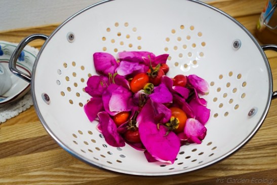 Van de zomer ging ik er met mijn man en zoontje tussenuit, naar een land waar ik steevast geniet van de vele wilde kruiden: Denemarken. We streken enkele dagen neer nabij Rorvig, waar je prachtige heidelandschappen en stranden aan een heldere zee. Hele gebieden worden hier overgenomen door Japanse bottelroos, Rosa rugosa. Ik herkende hem gelijk als exoot; de EU heeft hem (ik dacht sinds dit jaar) officieel aangeduid als invasieve exoot en ook in Nederland tiert hij welig in onder andere de duinen. Maar de bloemen ruiken zo heerlijk en de dikke, ronde bottels zitten o.a. vol met vitamine C en A, bovendien zijn ze makkelijker schoon te maken dan veel andere rozenbottels (ik kom straks terug op wat ik daarmee bedoel), dus oogsten is een win-win. Thee was nog het makkelijkste, zo op vakantie. Ik begon met plukken en al snel stond mijn zoontje, die inmiddels de 5 jaar alweer nadert, enthousiast mee te doen. Thee? Dat wilde hij ook wel proberen (want vreemd genoeg is hij gek op thee???). Ik had een boodschappentasje bij me, die al snel de heerlijke rozengeur verspreidde. Eenmaal terug in ‘ons’ huisje gingen we het samen maken.