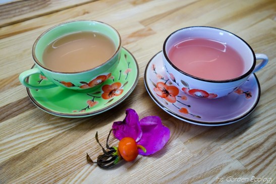 Het eindresultaat: twee mooie kopjes met heerlijk geurende thee, plus genoeg voor nog zo’n 2 kopjes. De thee is best zuur, vooral vanwege de bottels, dus heb ik voor mijn zoontje een beetje honing toegevoegd. Vooral lekker met je neus boven het kopje hangen is zo fijn bij rozenthee, plus de vitamines zijn mooi meegenomen.