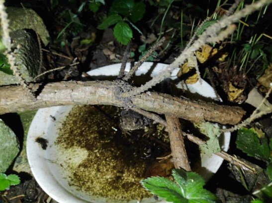 De waterschaal is ’s avonds áltijd bezet door een pad of een kikker.