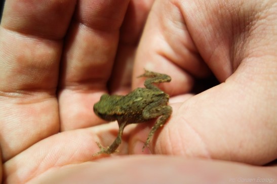 Inmiddels is het zo erg, ze komen zelfs massaal het huis binnen! Ik heb een hele hoop kleine kikkertjes gevangen en weer buiten gezet, die je zo even prachtig van dichtbij kunt bekijken. Het zijn kleine bruine kikkers, want de strepen langs de ogen kun je op zo’n moment heel goed zien. Ook meerdere padden hebben de woonkamer verkend, waarmee ze in de voetsporen treden van hun (groot?)moeder Archimedes. Zo kwam ik aan de foto’s hierboven!